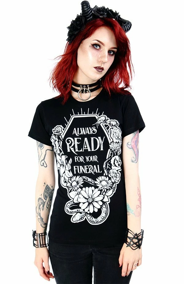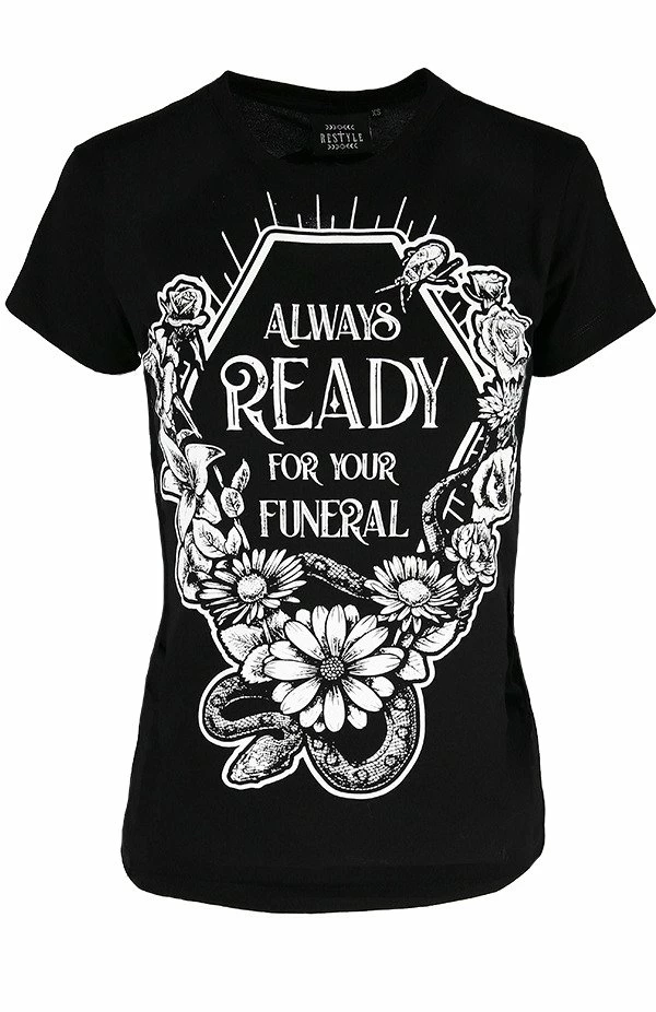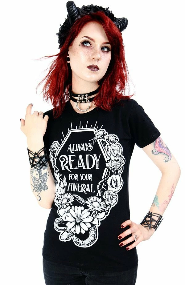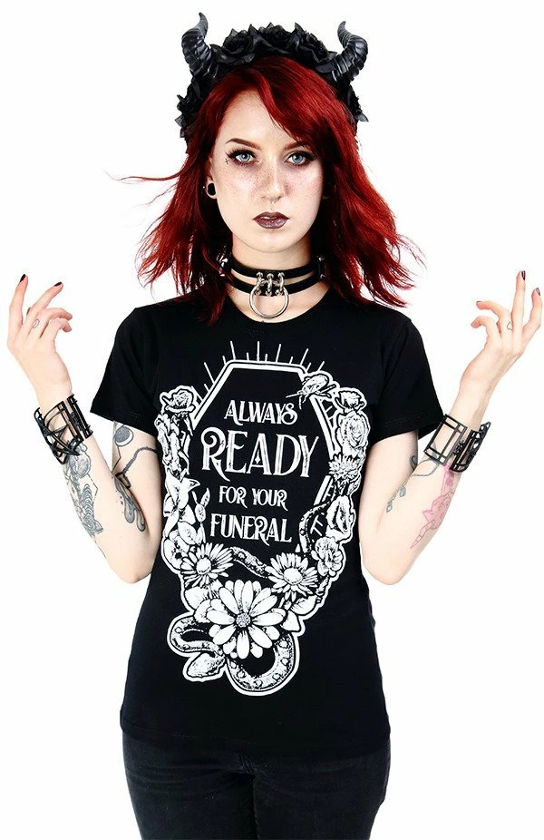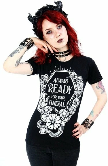 There is bold inscription “always ready for your funeral” in a coffin shape with flowers around it.
