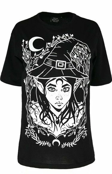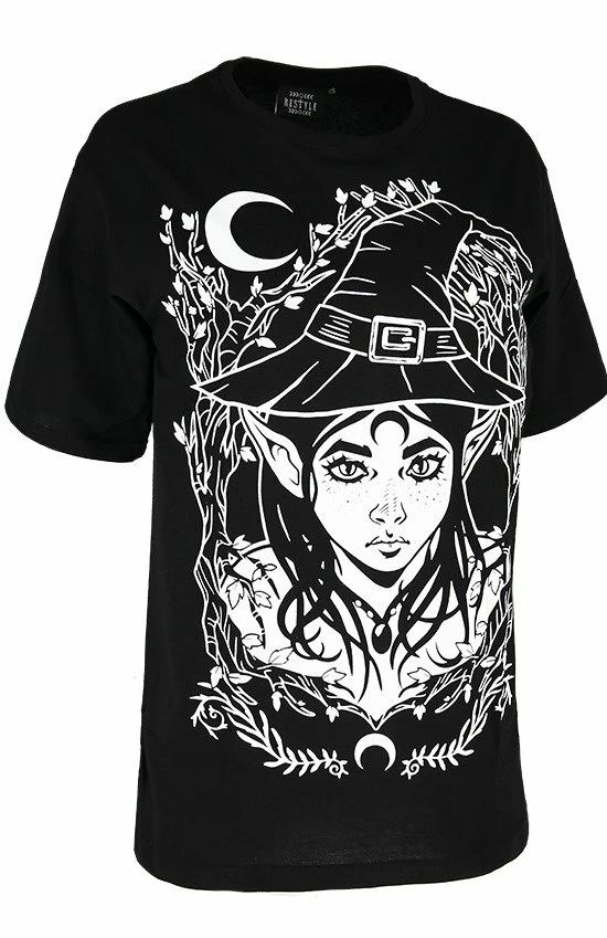 The witch’s hat and the crescent symbol add magical charm to the design.